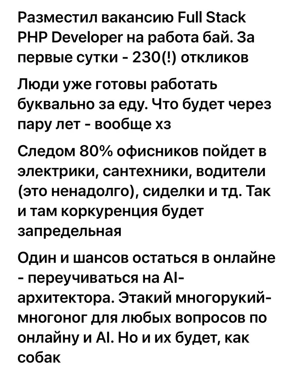 Ии сильно обесценивает любую работу за компом - 80% это рутина, которую ии возьмет на себя за копейки