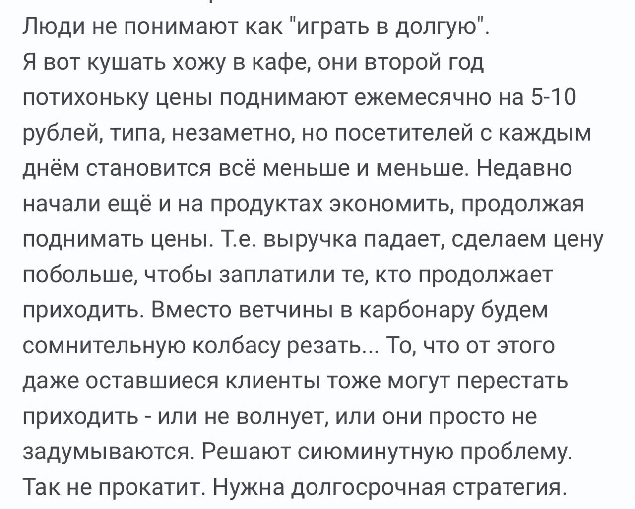 О том и речь. Аренда растёт, коммуналка растёт, сотрудники повышения з/п требуют, продукты в цене растут, бензин и доставка тоже