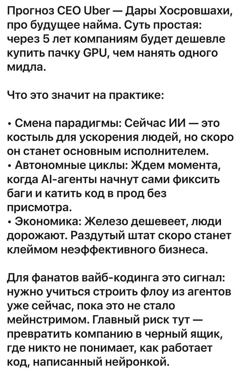Всегда интересно, ну вот высвободят море ресурсов, что они будут делать? Просто лежать? Кто тогда будет покупать услуги убера? У убера станет больше водителей? А кого возить они будут агентов ии? А что такого убер пишет каждый день нового? Кнопки двигает по экрану? Подстрает ui под психоз пользователя? Или пишет код чтоб писать код но с ии ?